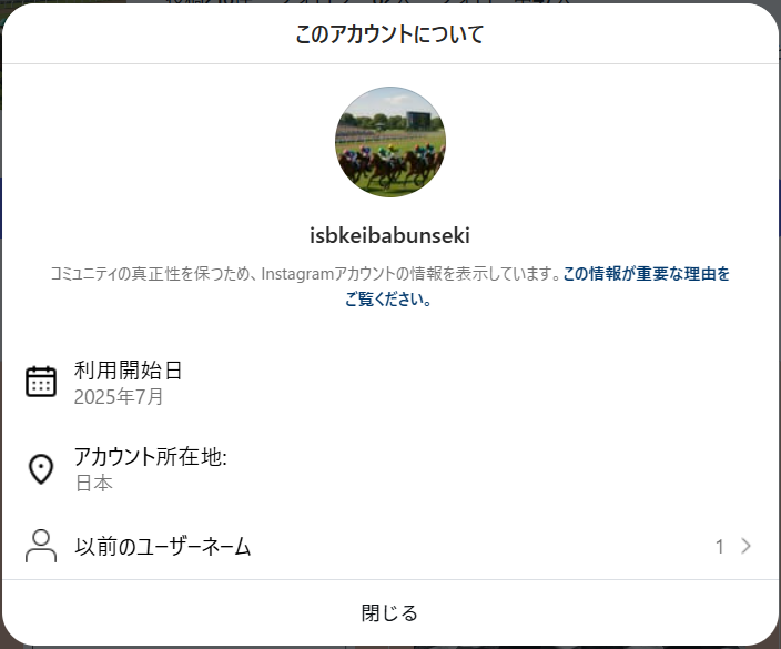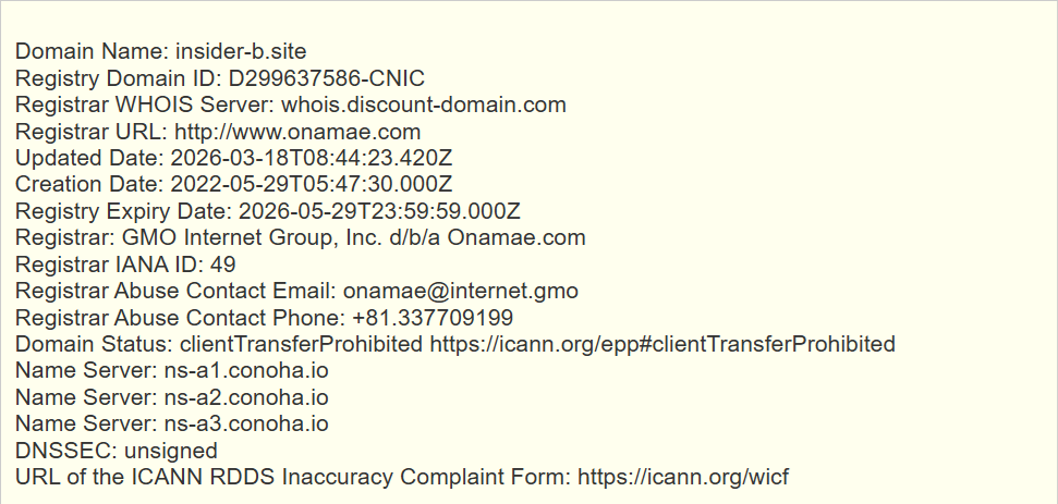 アカウント開設日は(2025年7月)で、最初の的中投稿は(2025年8月2日)で確認とれますがインサイダー馬券のドメイン(insider-b.site)の取得日は(2022年5月29日)の事から、サービス後にインスタアカウント開設~運用したと考えられ、特に不自然な点はありませんでした。