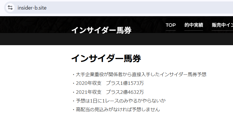 このように、「インサイダー」というヘビーなキーワードをサイト名と予想の根拠にしているのがインサイダー馬券ではありますが、真偽は不明の為、グレーなサイトである事は注意した方が良いかと思われます。