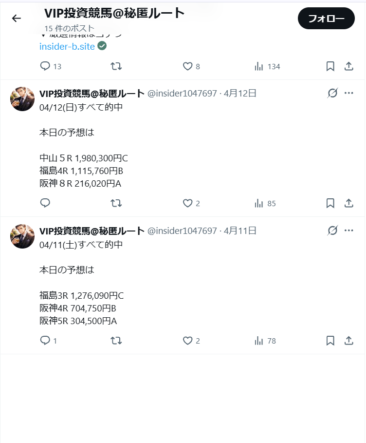 特にXだけに発信している事(お金配りや無料予想など)は無く、第三者をリポストしている事も無く淡々と実績投稿しているだけのようです。