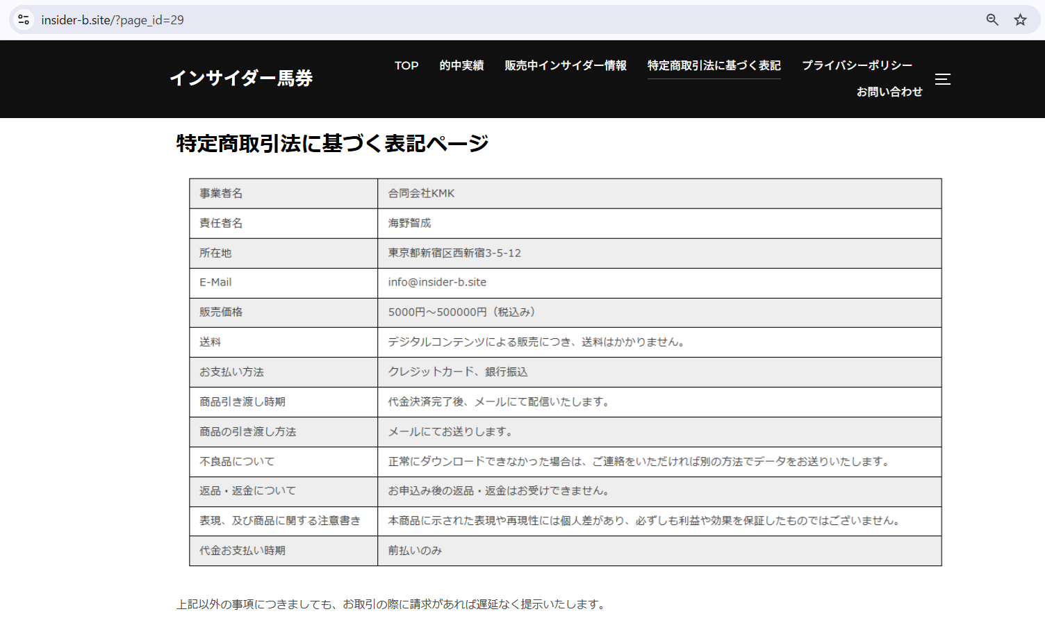 インサイダー馬券の特商法は事業者名や所在地など、記載あるもの「全て」テキストではなく画像として貼り付けて公開しています。