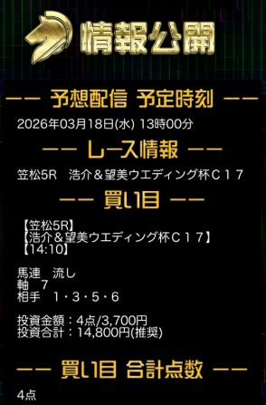 平日は地方競馬を馬連で2鞍、土日は3連単で中央競馬と地方競馬をそれぞれ買い目予想を提供しています。