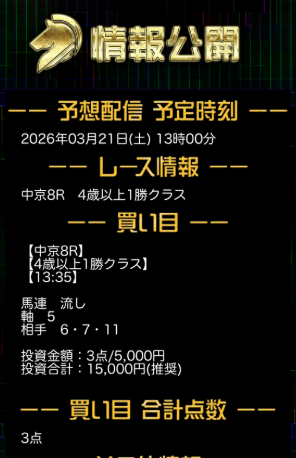 買い目がどのような予想なのか、結果などをご参考にお願いします。