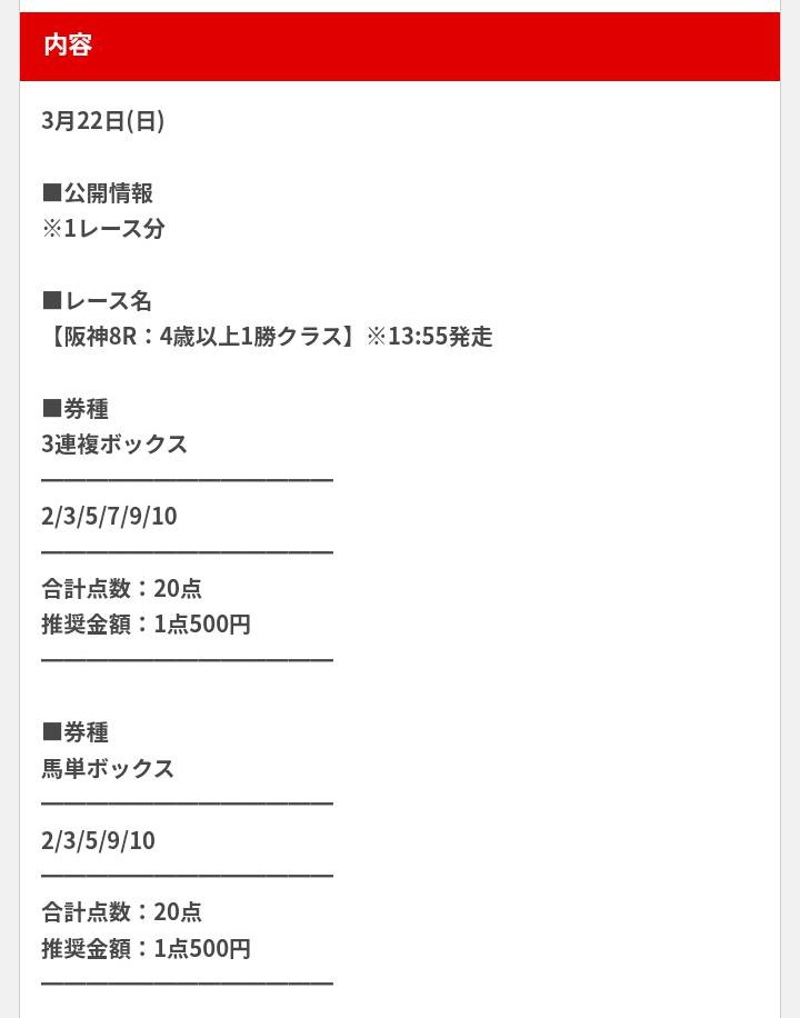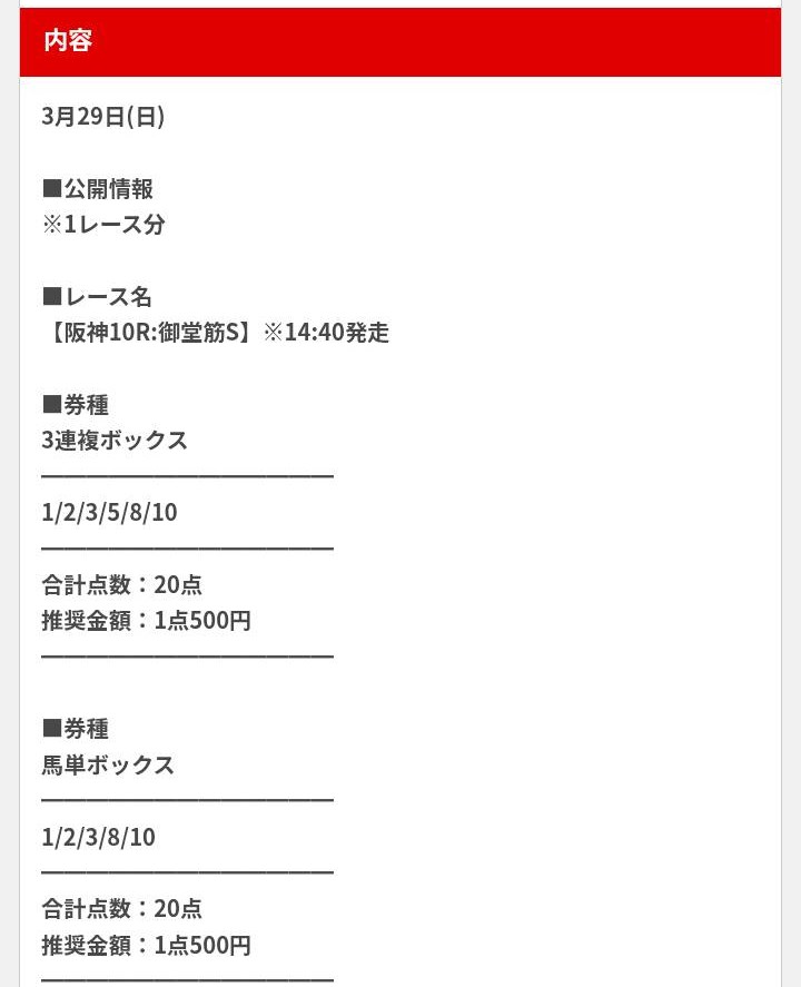 ■券種 3連複ボックス 3/4/6/8/10/11 合計点数:20点 推奨金額:1点500円